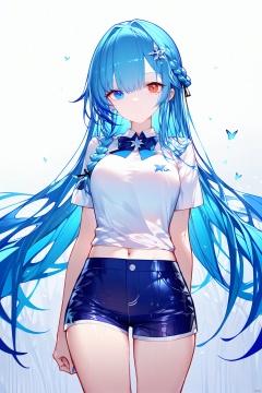 white shorts, hair ornament, short shorts, white shirt, shirt, braid, blue bowtie,