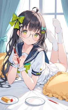 (best quality), ((masterpiece))1girl, solo, sailor collar, no shoes, short sleeves, glasses, socks, white socks, lying, bow, puffy sleeves, blush, hair bow, wrist cuffs, puffy short sleeves, frills, round eyewear, on stomach, dress, long hair, ahoge, green bow, window, soles, bangs, curtains, pillow, looking at viewer, holding pencil, food, holding, sailor dress, white dress, hair ornament, frilled pillow, pencil, parted lips, plate