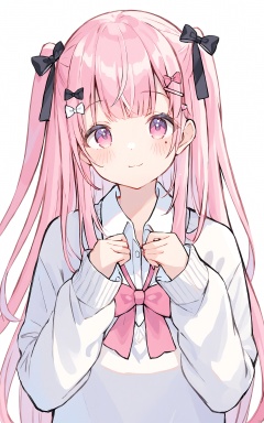 Thin lines, 1girl, solo, pink hair, long hair, bow, looking at viewer, hair ornament, pink bow, bangs, shirt, hairclip, two side up, upper body, white shirt, white background, collared shirt, long sleeves, closed mouth, mole under eye, sweater, hair bow, mole, breasts, pink eyes, simple background, :3, sleeves past wrists, very long hair, blush, pink bowtie, smile
