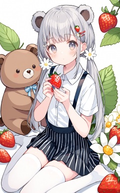 1girl, bear, shirt, skirt, strawberry, striped skirt, food, fruit, thighhighs, holding food, no shoes, wariza, collared shirt, white flower, low twintails, short sleeves, vertical-striped skirt, white shirt, striped, suspender skirt, holding, white thighhighs, vertical stripes, suspenders, black skirt, sitting, pleated skirt, dress shirt, solo, hair ornament, blush, twintails, flower, looking at viewer, white background, bangs, animal, hairclip, holding fruit, closed mouth, grey hair, nail polish, long hair