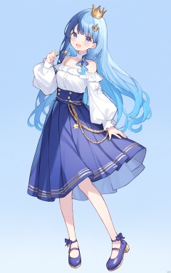 1girl, solo, puffy sleeves, blue hair, mini crown, skirt, shirt, crown, long sleeves, blue eyes, off shoulder, white shirt, long hair, :d, smile, blush, bare shoulders, purple footwear, shoes, off-shoulder shirt, very long hair, juliet sleeves, full body, bangs, blue skirt, multicolored hair, looking at viewer, pleated skirt, puffy long sleeves, standing, gradient hair