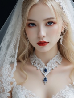 breathtaking vampire bride,film photography aesthetic,the delicate texture of lace veil gently obscuring her face,long blonde hair,looking at viewer,eye eye contact,sapphire red eyes,choker,devil smile,dynamic composition,skin texture,from above,sharp focus,horror \(theme\),dutch angle, . award-winning, professional, highly detailed
