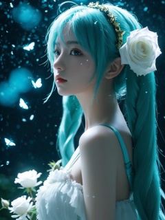 breathtaking face focus, masterpiece, best quality, 1girl, hatsune miku, white roses, petals, night background, fireflies, light particle, solo, aqua hair with twin tails, aqua eyes, standing, pixiv, depth of field, cinematic composition, best lighting, looking up . award-winning, professional, highly detailed