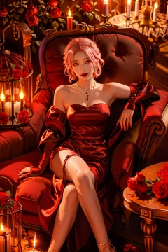 local blur, air expansion, air manipulation, fire-rose, rose petals, warm light, fire light, night, fireplace fire, fire, flame, candle in cage, flying sparks, spark, particle effects, flying rose petals, roses, detached sleeves, bridal gauntlets, backless outfit, bare shoulders, rdssd-red-detached-sleeves-sleeve-dress, 1girl, pink hair, solo, flower, short hair, jewelry, petals, rose, sitting, red flower, necklace, stairs, chandelier, gloves, holding, red lips, couch, candle, looking at viewer, red rose, wine glass, strapless, cup, strapless dress, alcohol, facial mark, candlestand, indoors, drinking glass, red eyes, makeup, anklet, chair, book, cage, wine, earrings, lipstick, breasts, birdcage, roses background<lora:fire-rose:0.6>,