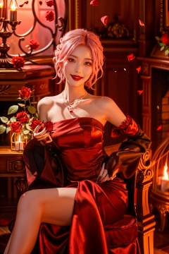 local blur,air expansion,air manipulation,fire-rose,rose petals,warm light,fire light,night,fireplace fire,fire,flame,candle in cage,flying sparks,spark,particle effects,flying rose petals,roses,bridal gauntlets,backless outfit,bare shoulders,rdssd-red-detached-sleeves-sleeve-dress,1girl,solo,pink hair,jewelry,red nails,sitting,red eyes,necklace,petals,looking at viewer,detached sleeves,forehead mark,stairs,indoors,flower,makeup,facial mark,red lips,candle,nail polish,smile,strapless dress,cup,lipstick,chair,breasts,strapless,lamp,short hair,drinking glass,forehead jewel,rose,wine glass,window,roses background,<lora:fire-rose:0.6>,