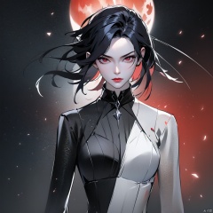 (High quality, high quality, artistic, beautiful, aesthetic: 1.2), girl, Gothic style, real person, shiny black hair, short hair, red eyes, sword eyebrows, sharp eyes, thin and pursed lips, sharp contours, slender figure, indifferent, grand, red moon, war background, half body photo, special effects, ultra clear, hazy,