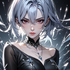 (masterpiece),(best quality),(super fine illustration),(beautiful and detailed eyes),{very detailed light},{painting},{{very fine 8K CG wallpaper}},anime,1girl,solo,beautiful detailed ice,beautiful detailed water,ice palace,galaxy,gem,jewelry,necklace,red eyes, sword eyebrows, sharp eyes,Gothic style