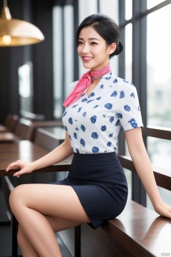 plns,dhkj,1girl,asian,solo,pretty,charming,exquisite facial features,smile,(dh shirt:1.2),skirt,nude pantyhose,black hair,Silk scarves,high heels,(full shot),in cafe,drinking,(ambient light),(cinematic composition),Accent Lighting,Volumetric lighting,plns,blurry,(masterpiece, realistic, best quality, highly detailed, profession),plns,dhkj