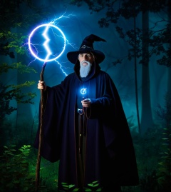 (Game CG style:1.2),(detailed light), ((lightning in hand)),lightning surrounds,(((lightning chain))),Game CG style, this dark wizard holds a staff with branches, wearing a long cloak and a hat, holding a circular magic circle in his hand, surrounded by a forest in the background. the image has a mysterious and magical atmosphere. keywords: dark wizard, staff, cloak, hat, branches, magic circle, forest, mystery, magic,