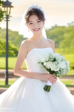 ((HRD, HUD, 8K)),((masterpiece, best quality)), highly detailed, soft light,WEDDING, 1girl, dress, jewelry, flower, earrings, smile, solo, necklace, wedding dress, blurry background, white dress, blurry, veil, black hair, bouquet, holding, grin, looking at viewer, strapless dress, strapless, brown hair, hair bun, <lora:20240407-1712491685411:0.8>