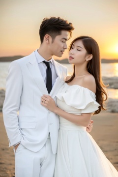 ((HRD, HUD, 8K)),((masterpiece, best quality)), highly detailed, soft light,WEDDING, 1girl, 1boy, necktie, formal, suit, brown hair, realistic, long hair, dress, closed eyes, black hair, looking at another, simple background, shirt, off shoulder, white dress, bare shoulders, white suit, lips, brown eyes, <lora:20240407-1712491685411:0.8>