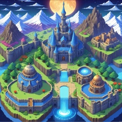 High mountains, a vibrant one, with all kinds of magical plants glowing in the moonlight, with a castle in the background. , Illustrated, 3d, Cartoon, High resolution, High quality, Detailed, Masterpiece, hdr, Sharp, [Pixel art style], [Abebe style], amazing, beautiful, amazing, brilliant, incredible,