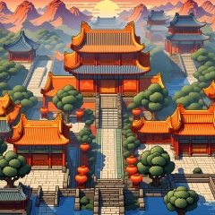 Tang Dynasty of China, a vibrant, there are all kinds of amazing plants in the glow, the background is Tang Dynasty architecture of China, illustrated, 3d, cartoon, high resolution, high quality, detailed, masterpiece, hdr, sharp, [pixel art style], [Abebe style], amazing, beautiful, amazing, amazing, brilliant, incredible,