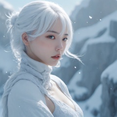 Illustrate a girl with the power of ice, featuring ice-white hair and clothing, set in a snowy landscape. Emphasize (((intricate details))), (((highest quality))), (((extreme detail quality))), and a (((captivating winter composition))). Use a palette of cool blues and whites, drawing inspiration from artists like Artgerm, Sakimichan, and Stanley Lau,midjourney,