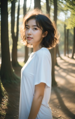 (nature, buildings history modern art, amazing unreal background),(natural colors, correct white balance, color correction, dehaze,clarity),RAW photo,full sharp,wallpapper 8k uhd,dslr,soft lighting,high quality,Fujifilm XT3,1girl, in the woods, plants and flowers, dynamic angle, slight smile, short curly hair, casual T-shirt dress, , delicate lighting and shadows, delicate natural skin texture,  slight makeup, pretty face, delicate eyes,  jenny, light smile, light_particles, lens_flare, blurry, daylight,Wearing a trendy T-shirt,