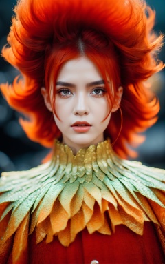 Fashion photography portrait, close up portrait, (1 girl is surrounded by flame lava , red hair:1, wear fire flame lava outfit coat fire flame lava fashion costume with ruffled layers:1),,