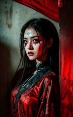 horror-themed (best quality, masterpiece:1.2),ultra high res,(photorealistic:1.4),great textures,ultra high res,(realistic:1.3),A spectral bride with unsettling makeup sits solemnly inside a shadowy,ancient coffin,draped in a traditional Chinese bridal gown of deep,dark red hues. The surrounding room exudes a grim atmosphere,bathed in an ominous,dark crimson light that casts eerie shadows over faded,ornate patterns on the walls,enhancing the macabre and chilling ambience of the scene,a zombie girl,dead women,rotting on face,from front,blood on neck,dirty on face,steel-blue dead face . eerie,unsettling,dark,spooky,suspenseful,grim,highly detailed,,