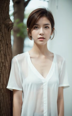 a woman standing next to a tree with a white shirt on and a white shirt on her chest and a white shirt on her shoulder,1girl,solo,brown hair,short hair,dress,realistic,brown eyes,white dress,lips,looking at viewer,,