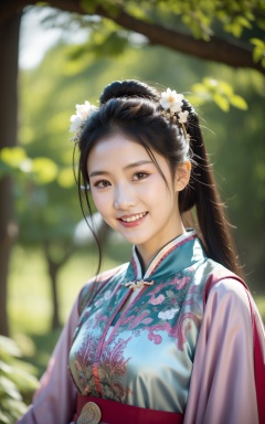 chinese_clothes,hanfu,a girl smiling at the camera with trees in the background,solo,outdoors,tree,day,smile,long hair,looking at viewer,long sleeves,flower,teeth,upper body,dress,black hair,hair ornament,