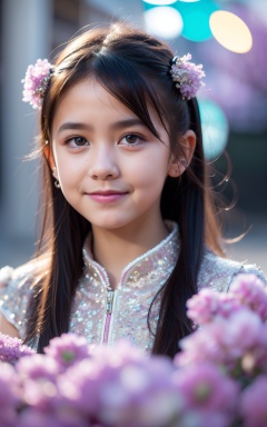 Tangible,jewel-studded collar,Acid colors markings,shimmering fur,Maroon crystal ball,enchanted cityscape,soft Lavender flowers,rendered in digital art by Catherine Garvey,Marty M.E. Stocker,4K,HDR,high contrast,stylized,little girl's innocent smile,
