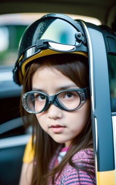 a young girl wearing a helmet and goggles with a helmet on her head and a car door open,depth of field,realistic,solo,1girl,lips,(brown eyes),brown hair,goggles,helmet,tears,hat,nose,looking at viewer,