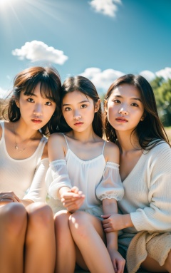 sunrays,(nature, amazing unreal background),(natural colors, correct white balance, color correction, dehaze,clarity),RAW photo,full sharp,wallpapper 8k uhd,dslr,soft lighting,high quality,Fujifilm XT3,Three girls sitting on an outdoor bench,Close-up,telephoto lens,