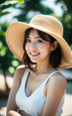 Ultra-realistic 8k CG, masterpiece, best quality, (photorealistic:1.4), HDR, absurdres, Professional, RAW photo, lens flare, (film grain:1.1), Bokeh, ((Depth of field)), studio light, a woman wearing a straw hat , a piece of watermelon and smiling at the camera, 1girl, hat, lips, looking_at_viewer, polka_dot, short_hair, solo, straw_hat, sun_hat. Highly detailed,Professional,extreme detail description;,