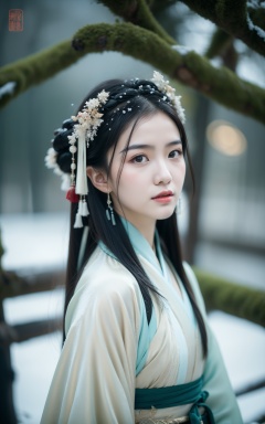 cinematic film still,bare_tree,branch,tree,snow,1girl,silk,winter,snowing,artist_name,chinese girl,wearing a hanfu head,chinese ancient hair accessories,gorgeous ornaments,. shallow depth of field,vignette,highly detailed,high budget,bokeh,cinemascope,moody,epic,gorgeous,film grain,grainy,