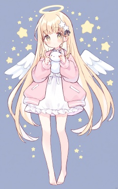 solo, 1girl, white background, full body, wings, barefoot, white wings, jacket, feathered wings, dress, very long hair, blush, long hair, halo, simple background, bangs, puffy sleeves, open jacket, puffy long sleeves, standing, hair ornament, looking at viewer, open clothes, long sleeves, star \(symbol\)