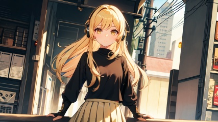 masterpiece,best quality,cinematic light,dramatic light,best shadow,colorful,wallpaper,high contrast,best illumination,ultra-detailed,an extremely delicate and beautiful,dynamic angle,depth of field,cowboy shot,upper body,<lora:lumine:0.5>,1girl,(solo:1.2),hair ornament,yellow eyes,(lumine (genshin impact):0.8),(pleated skirt:1.3),(black shirt:1.3),headphones,perfect face,perfect eyes,outdoors,sidelighting,street,phone booth,cityscape,shop,handrail,street lamp,power lines,