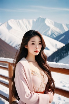 a beautiful chinese girl,elegant style, long hair, prefect face, brown eyes, makeup, blush, lips, (curvy), big tits, thin waist, (looking at viewer), standing in the snow, winter, snow mountain, (film grain), 35mm film, by leica m50 f/1.9