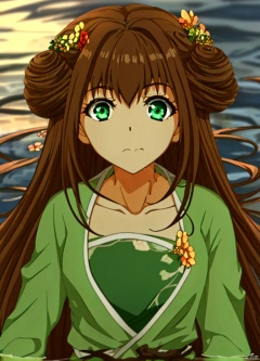 bangs, brown hair, hair ornament, long sleeves, very long hair, closed mouth, green eyes, flower, hair flower, hair bun, sash, double bun,