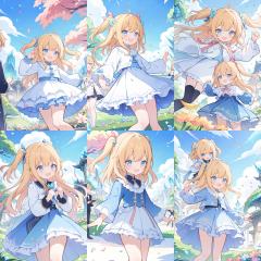 ((masterpiece)),(best quality),(beautiful detailed eyes),(ultra-detailed),(finely detail),(highres),((little female child)),two side up,detailed beautiful long blonde hair,pink ribbon,detailed beautiful blue eyes,white frilled dress,lace-trimmed,long sleeves,flower garden,wind,happy,laughing,confetti,petals,blue sky with clouds,(crystal trees:1.2),(detailed beautiful flowers:1),detailed beautiful background,<lora:liyueFP8-000002:0.7>,