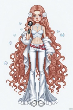 A girl with Strawberry red ultra-long curly hair is wearing a Shell-shaped white underwear, white underwear, pink belt and slim flared jeans with a lot of embroidery. Many white roses and transparent bubbles decorate her hairs. A blue microphone decorated with diamonds is in her hand. Simple pose, full body, delicate accessories, everskies(1), QQshow, pixel style, masterpiece , everskies