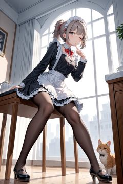 masterpiece, best quality, 1girl, solo, indoors, animal ear fluff, animal, apron, black dress, black footwear, black jacket, black pantyhose, black thighhighs, brown hair, closed mouth, dress, expressionless, finger to mouth, frilled apron, frilled dress, frills, from below, grey eyes, grey hair, jacket, leaning forward, long sleeves, looking at viewer, maid, maid apron, maid headdress, neck ribbon, one eye closed, pantyhose, ponytail, red ribbon, ribbon, short dress, short hair, sidelocks, sitting