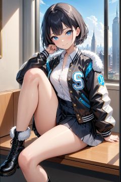 masterpiece, best quality, 1girl, solo, indoors, black footwear, black hair, black jacket, black skirt, blouse, blue eyes, boots, closed mouth, collared shirt, formal, fur trim, fur-trimmed jacket, jacket, letterman jacket, long sleeves, looking at viewer, miniskirt, open clothes, open jacket, pleated skirt, shirt, short hair, sitting, skirt, smile, white shirt, window