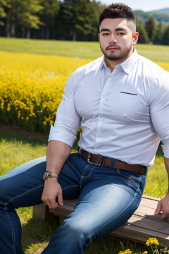 Best quality,masterpiece,ultra high res,male focus,pants,boy black short hair,(Plump man:0.5),detailed background,game_cg,bara stocky,male fucus,mature male,thick thighs,muscular male,(fade haircut),Boy,Male focus,solo,sitting,reality,belt,looking towards the camera,outdoors,rapeseed flowers,pants,casual pants,shirt,clothes,in a meadow,bust,medium_shot<lora:EMS-342200-EMS:0.800000>