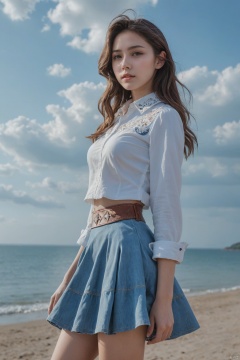 1girl,(medium hair:1.4),outdoors,(front:1.3),(standing:1.3),seaside,cloudy sky,High-low skirt,(cowboy_shot:1.2),navelwavy hair,