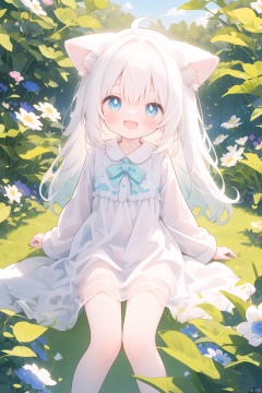 Girl, alone, loli style, animal ears, cat ears, cat tail, white hair, blue pupils, bright sunshine, happy expression, joyful atmosphere, cat ears drooping, grass, lush green, flowers blooming, bright colors, natural light and shadow.