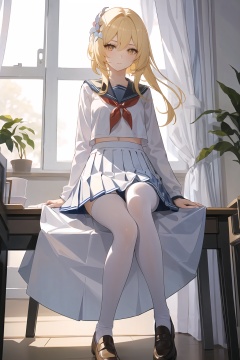 insanely detailed,absurdres,ultra-highres,ultra-detailed,best quality,slender,kawaii,perfect symmetrical face,ultra cute girl,ultra cute face,ultra detailed eyes,ultra detailed hair,ultra cute,ultra beautifu,1girl,lumine \(genshin impact\),solo,breasts,yellow eyes,sitting on object,indoors,bedroom,sitting,school uniform,<lora:wsal:0.4>,white pantyhose,serafuku,plaid_skirt,pleated skirt,<lora:lumine-000008:0.9>,