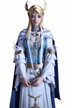 ((HRD, HUD, 8K)),((masterpiece, best quality)), highly detailed, soft light,1girl, solo, long hair, circlet, blonde hair, blue eyes, lips,jewelry, breasts, cleavage,dress, cape, simple background, white background, cowboy shot, standing, looking at viewer, <lora:20240408-1712537700209:0.73>