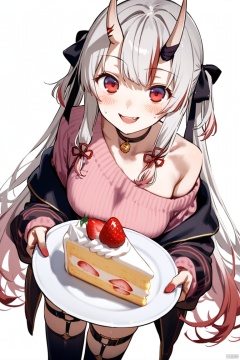 1girl, solo, long hair, breasts, looking at viewer, blush, smile, open mouth, bangs, simple background, hair ornament, red eyes, thighhighs, long sleeves, white background, bow, ribbon, holding, bare shoulders, twintails, collarbone, hair ribbon, white hair, :d, hair bow, red hair, multicolored hair, food, horns, choker, fang, black thighhighs, virtual youtuber, off shoulder, sweater, streaked hair, gradient hair, thigh strap, fruit, black choker, x hair ornament, plate, cake, oni horns, oni, strawberry, fork, off-shoulder sweater, holding plate, holding fork, pink sweater, cake slice, incoming food, nakiri ayame