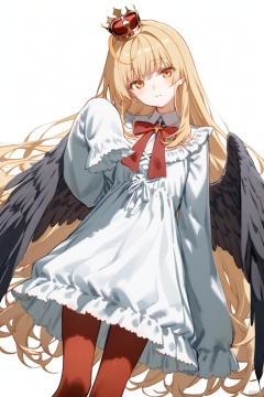 1girl, solo, long hair, looking at viewer, bangs, blonde hair, long sleeves, white background, dress, bow, very long hair, closed mouth, yellow eyes, pantyhose, frills, wings, wide sleeves, white dress, red bow, head tilt, sleeves past wrists, feet out of frame, frilled dress, crown, feathered wings, sleeves past fingers, black wings, mini crown, red pantyhose