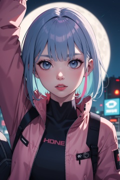 lucy \(cyberpunk\),1girl,arm up,bangs,blue hair,colored tips,full moon,grey eyes,jacket,long sleeves,looking at viewer,medium hair,moon,multicolored hair,parted bangs,parted lips,pink hair,portrait,red eyeliner,red lips,solo,white jacket,cyberpunk \(series\),cyberpunk edgerunners,<lora:lbc_lucy240408_v1.0:0.8>,BREAKsharp focus,8k high definition,35mm film photography,insanely detailed,photographic accuracy,