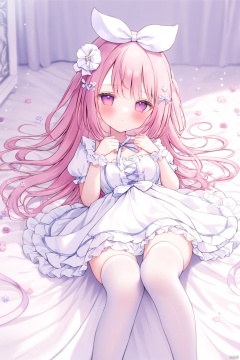 1girl, omochi_monaka, white dress, pink hair, long hair, white thighhighs, hair ornament, ribbon, hair bow, lying,