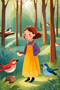 Children's picture book style,Overall,this is a beautiful and serene image that captures the essence of a  in the woods. The woman's calm demeanor and the birds' activity add a sense of liveliness to the scene,making it a captivating and memorable image.,
