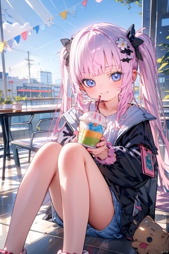 (best quality),(masterpiece),1girl, solo, cup, food-themed hair ornament, short sleeves, food, hair ornament, flower, open jacket, closed mouth, open clothes, holding, bangs, smile, jacket, candy hair ornament, drinking straw, pennant, hair flower, twintails, wrist scrunchie, scrunchie, holding cup, looking at viewer, pants, sitting, long hair, blue eyes, blush, candy wrapper, jewelry, striped, dress, white flower, striped bow, bendy straw, blue jacket, feet out of frame, disposable cup, knees up, macaron, bow, teacup, string of flags, pink scrunchie, ice cube, ringlets