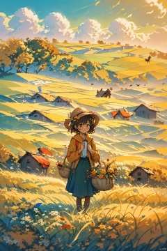 a girl standing in the field,holding a basket in one hand,the other hand waving in the air to say hello,1 girl,autumn,field,flower field,grass,nature,outdoor,solo,rice,mature rice,harvest,yellow theme. beautiful background,bichu,oil painting,Impressionism,