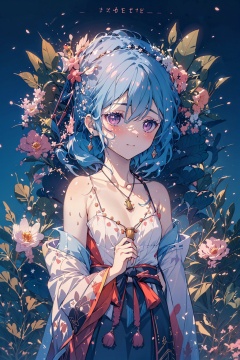 masterpiece,best quality,best quality,official art,extremely detailed CG unity 8k wallpaper,(1girl:1.3),cute face,blush,black eyes,pink eyeshadow,flat chest,hanfu,(Out of the shoulders),pendant,jewelry,jewelry,(earrings:1.1),(bell:1.1),(necklace:1.1),hair ribbon,Hand on chest,hair_ornament,hair_flower,Bright necklace,Out of the shoulders,Perfect hand,(collarbone:1.1),cleavage,(Shoulder trim:1.2),(Chest decoration:1.3),Look to the sky,(Look the other way:1.2),(Fineskindetails:1.1),mix4,machinery,Open chest,