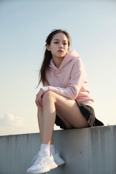 (best quality), (masterpiece), 1girl, hoodie, white hoodie, long hair, skirt, shoes, sitting, outdoors,black eyes, black hair, long sleeves, bangs, hair ornament, sleeves past wrists, sneakers, day, pleated skirt, sky, cloud, black skirt, solo, blue sky, ahoge, hair between eyes, very long hair, closed mouth, white footwear, looking at viewer, blush, drawstring (hdr:1.4), high contrast, (cinematic, teal and orange:0.85), (muted colors, dim colors, soothing tones:1.3), low saturation, jiaxin